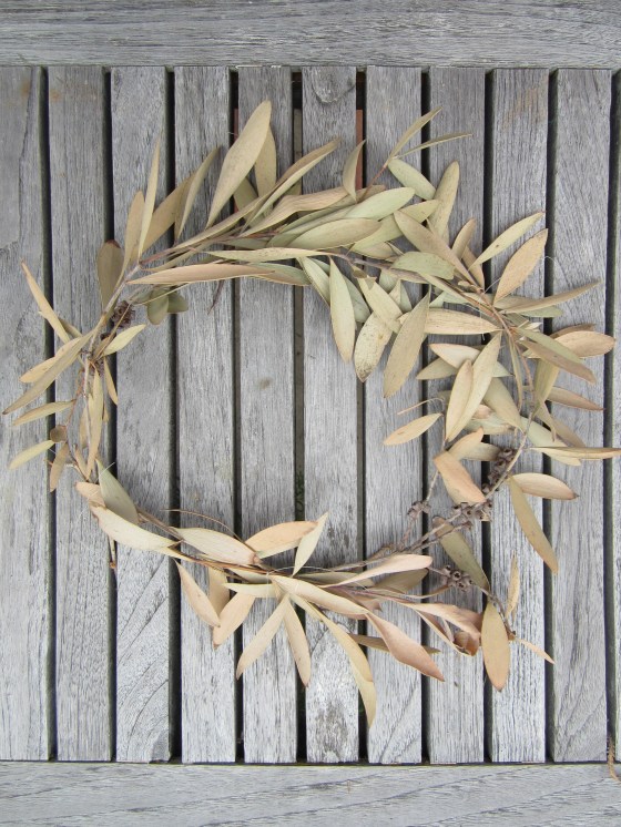 Lavender makes a wonderfully simple wreath, yet its sweet fragrance is sublime. The scent will permeate your space and inspire you for more spring projects. Tiny olive branches do the trick as well. Since my parsley is abundant, I tried it with its flower clippings. Warning keep this one outdoors if you create one of your own, the pollen will sprinkle your indoor space with its yellow dust.
