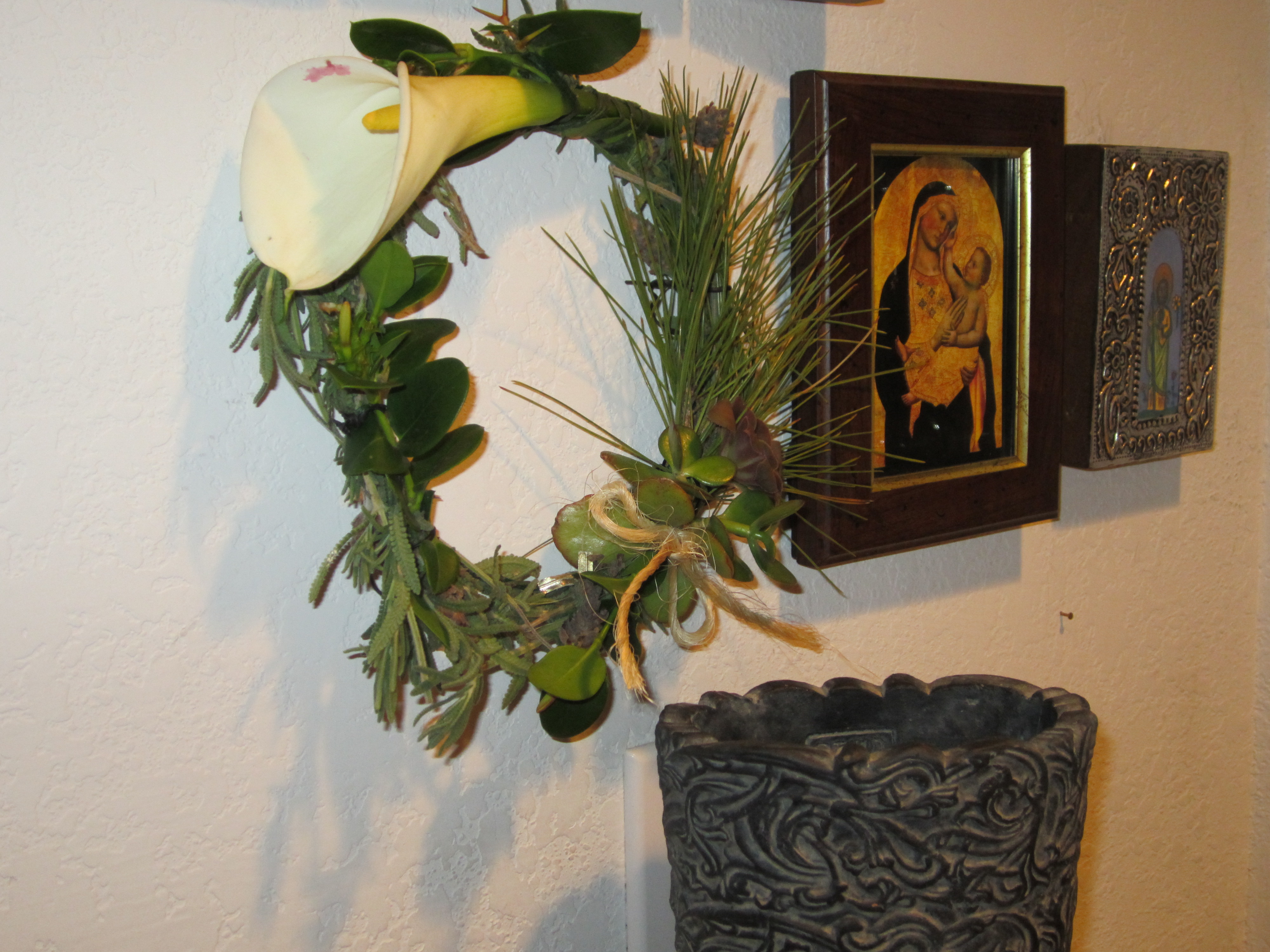 Searching for the perfect location for your labor of love project is just as important. Placing it on the front door will not only make an impression with visitors; it will also make you smile when you walk through your door. If you do not use your front door daily, consider another place you would enjoy seeing and possible smelling your wreath. The bedroom is a great one—to see a fresh made wreath every morning and before going to bed is not only cheery but also peaceful. Have space on the wall in the kitchen? Why not, after you finish saying Great Appetite or Happy Chowing (the preference is yours since there is not an official saying) you can look up at your wreath and smile.
