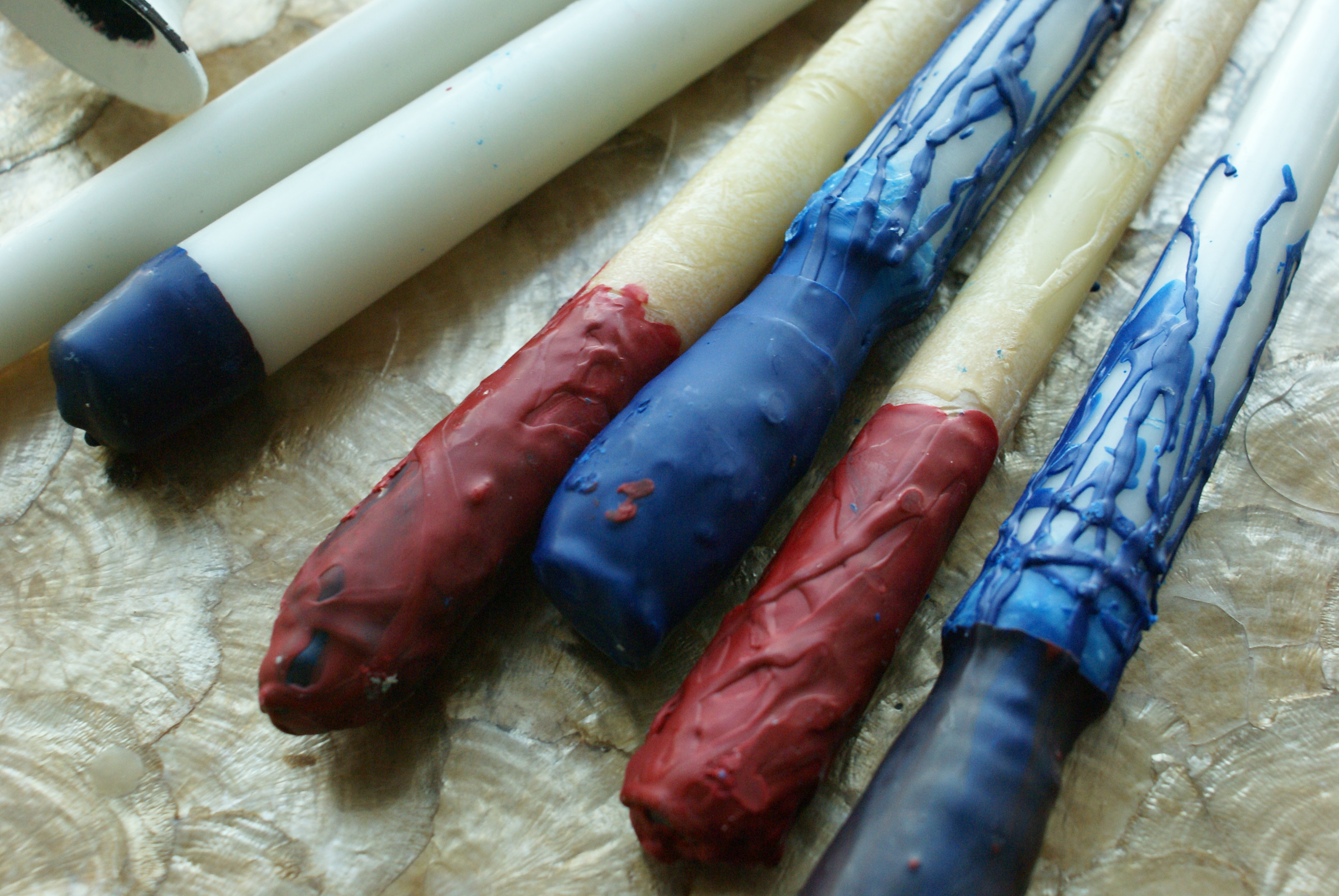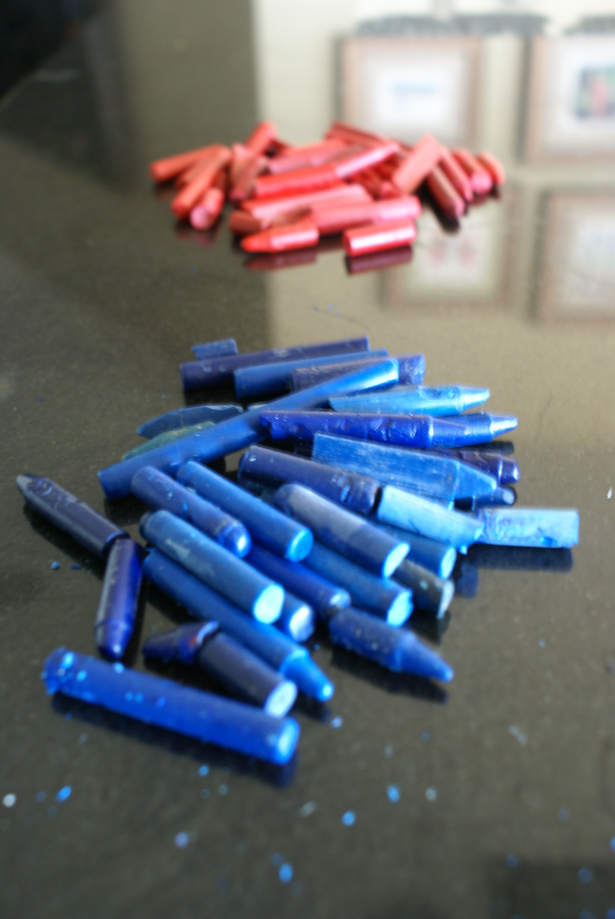 My favorite part of the weekday is wrapping my arms around my little ones when I pick them up from their long day at school. Mornings always flash by like a bolt of lightening that I barely have a chance to utter, “work hard” or “I love you” as they make a mad dash from the car to their weekday haven. But those late afternoons as the evening chill sets in, I can grab and hug them for a much longer duration. Just enough squeezing time where I inhale a mix of sweat and dirt from the intense outdoor play or sometimes the aroma of tempera paints or crayon still engrained under their fingernails. It’s this time as well as when I get a few more hugs before bedtime that my heart melts. In reality if they asked me for something at that moment I would undoubtedly cave in—what can I say, love makes one vulnerable. So what will I do special for all the boys in my nest this 14th of February? Well for starters, this year’s Valentine décor brings us back to the lab—melting abused crayons to create our new holiday look with candles. We decided on a passionate red, however, the flip side of eros is the cool and compassionate blue of agape, an unconditional love. The two colors of love therefore balance our nest with a wholesome energy.