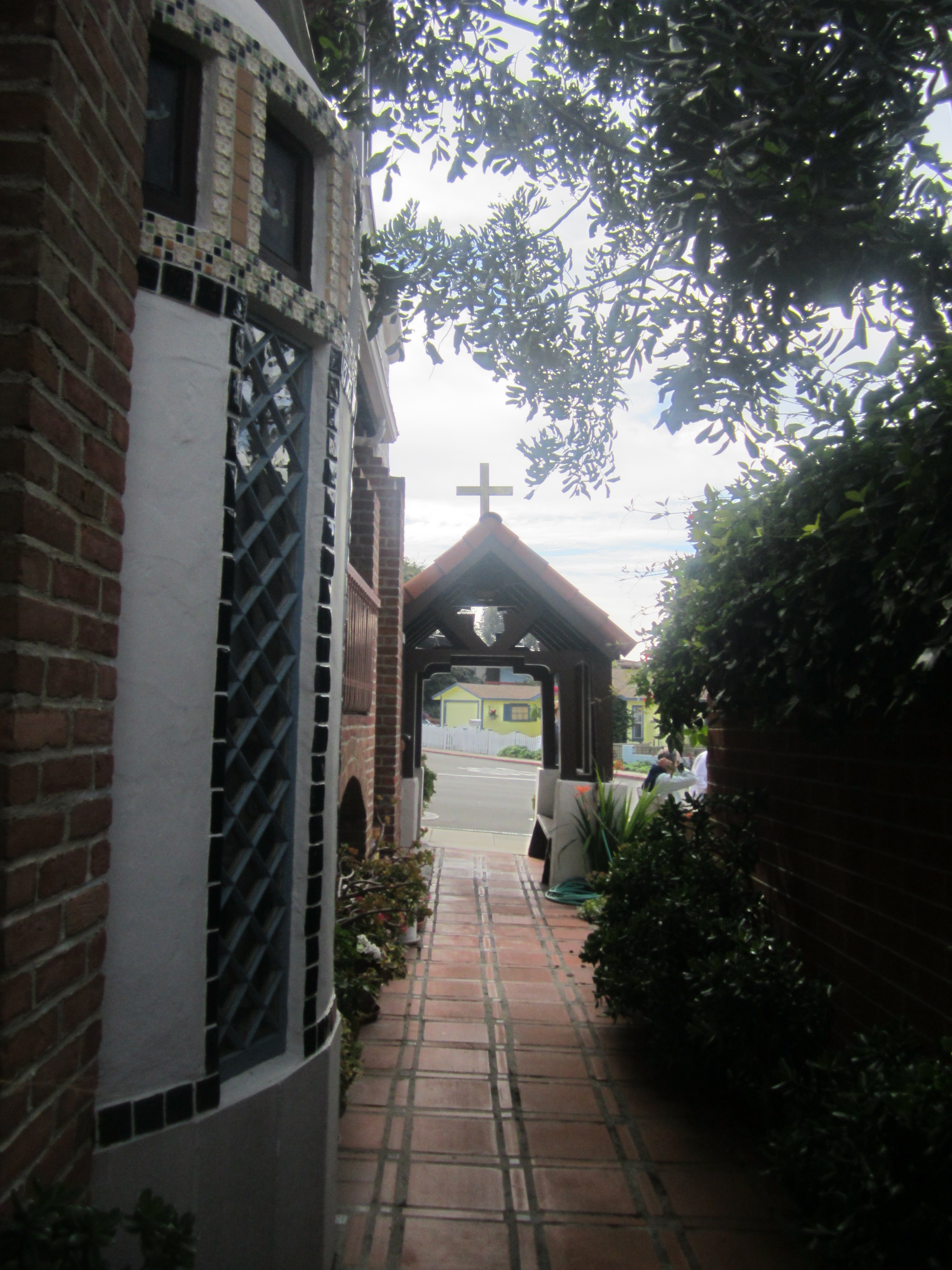 Although we came unannounced and unsure if we could enter this house minutes away from the beach, the guardian heard our whispers from the gardens and burst out to greet and welcome us in with an impromptu tour. The ten or so of us scampered on in, engrossed the miniscule one room house and stopped in our tracks in awe. The diminutive cathedral was built in 1933 with rubble from the Long Beach earthquake. The design reflects the religious roots of the church, a combination of Christianity and theosophy–philosophies incorporating a variety of beliefs including elements of Eastern religions.