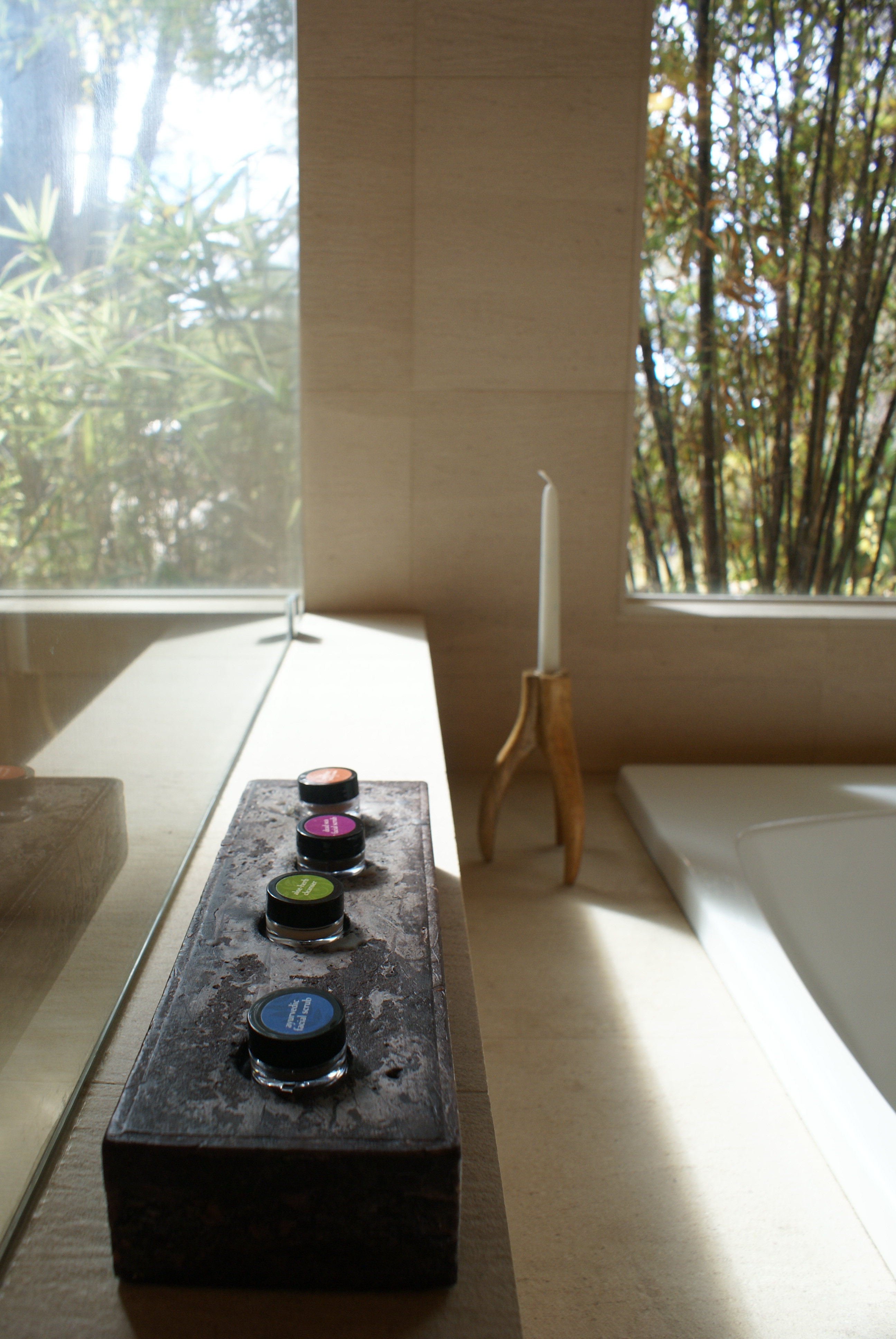 • Thank you! Yes it was a pleasant surprise how they fit so well, always thinking about re-purposing. Our bathroom is our relaxing retreat…I love how our landlord once again incorporated nature into the space. Happy healthy eating and applying!