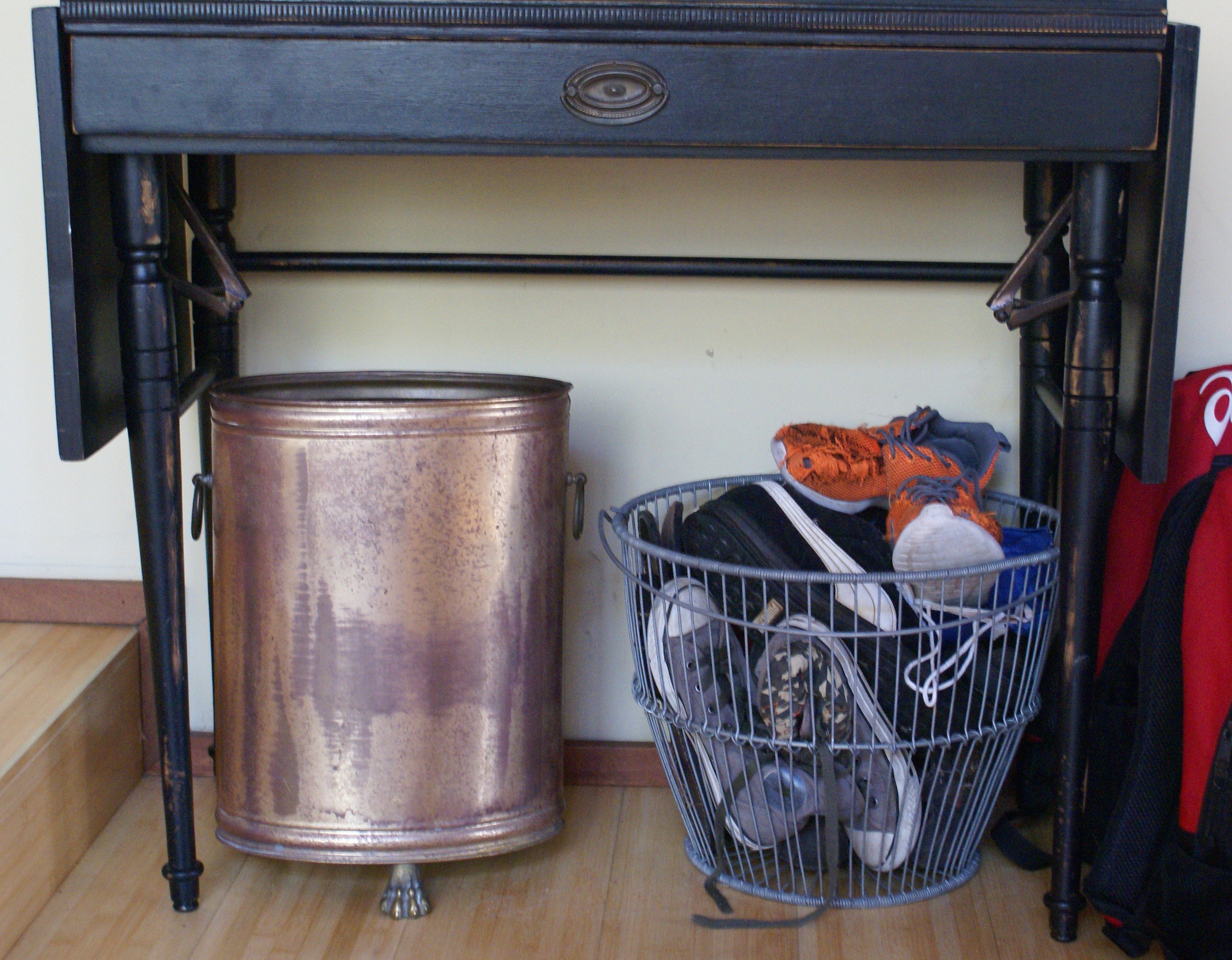 The traditional translation of the infamous French phrase supposedly spoken by a great princess upon learning that the peasants had no bread is commonly attributed to Queen Marie Antoinette, however, there is no record of her ever uttering the callous and ignorant remark. Despite her own undeniably lavish lifestyle, she was an intelligent woman who donated generously to charitable causes and displayed sensitivity towards the poor population of France. I recently purchased a piece for the entry way of my nest eager in creating another vignette but also in anticipation of good cheer to come and to organize the agonizing shoe and backpack issues of our foyer. My inspiration was sweet, rosy faced Marie Antoinette, a tenderhearted grande dame. To add a bit of glam that she adored, I capped the weathered piece