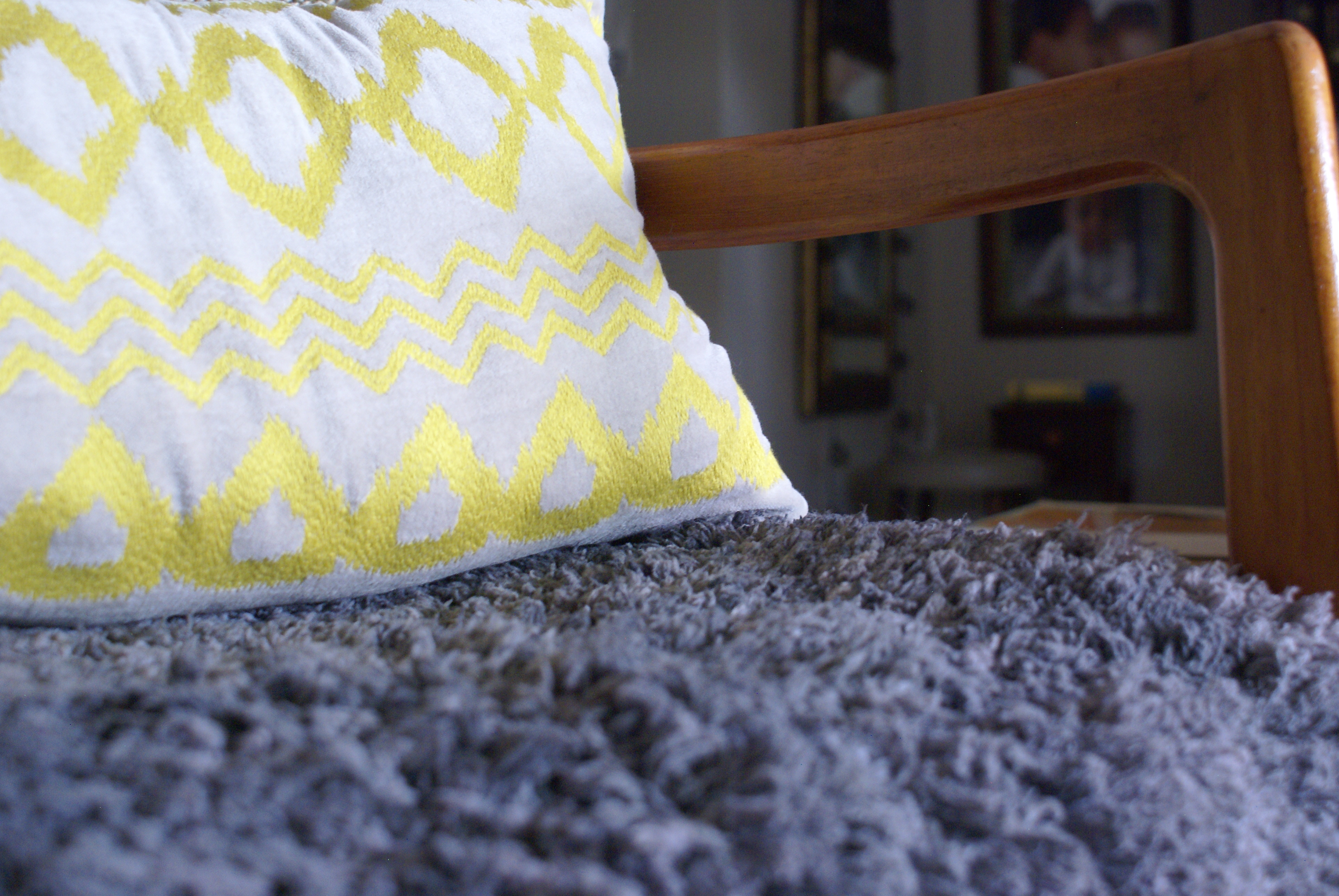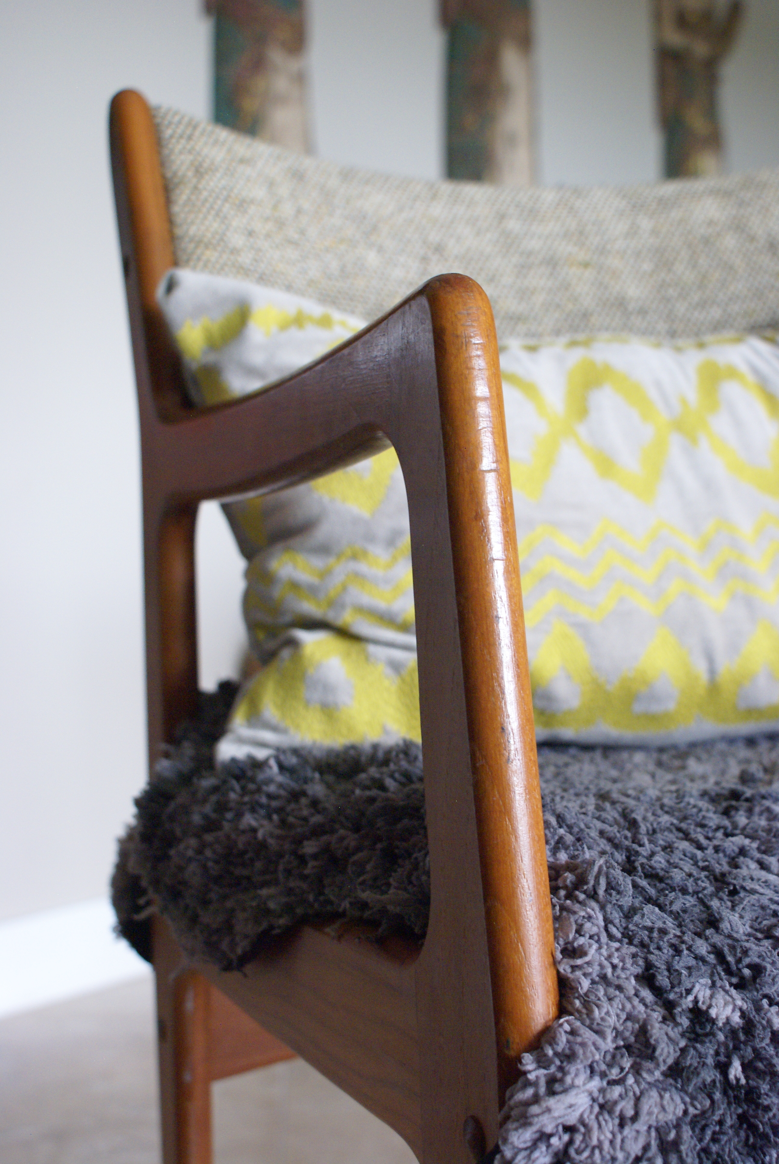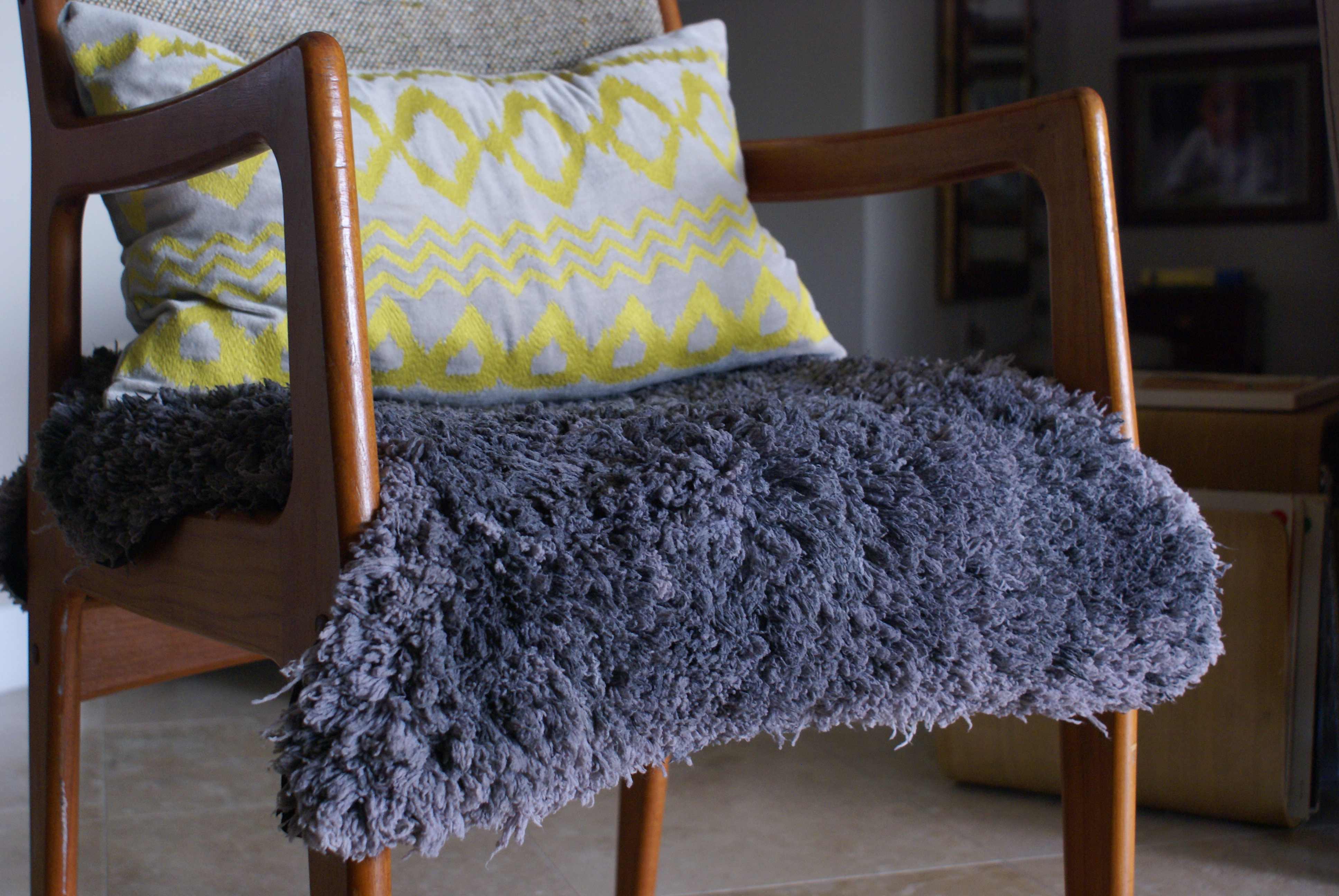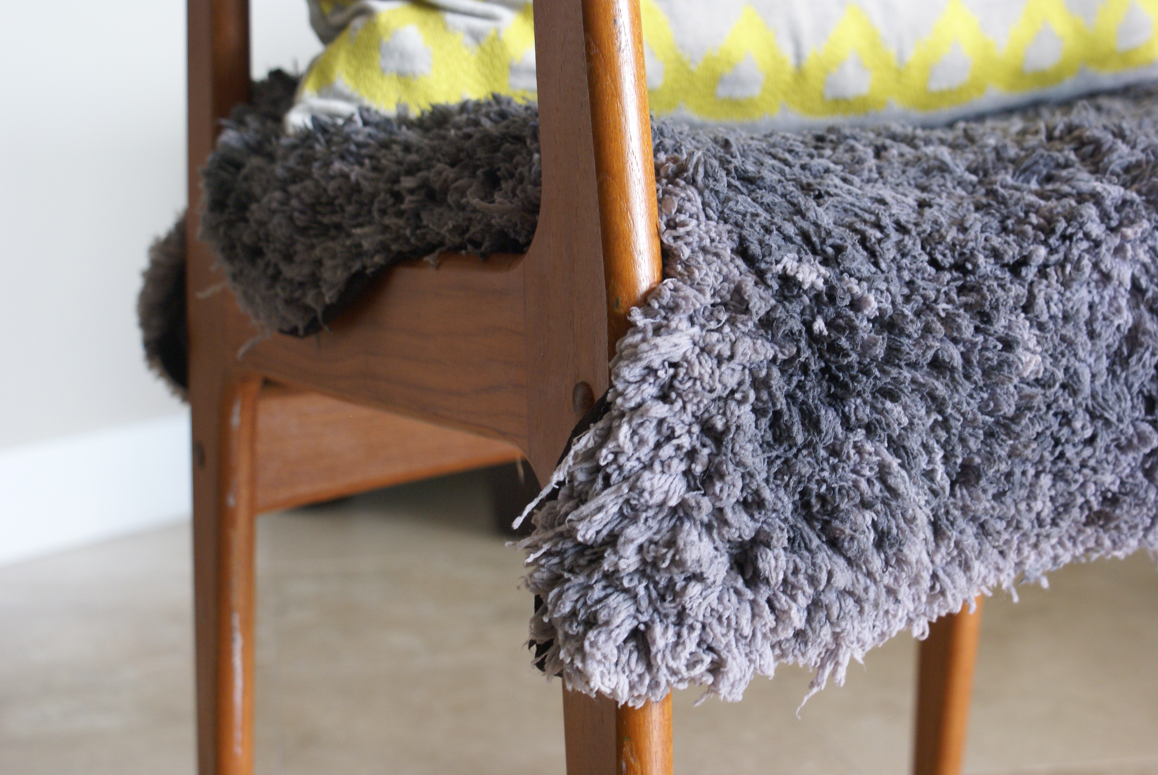 For some of us it feels a bit uncomfortable…others thrive on the idea of sharing their time with others not like them. I often lean toward mixed company or eccentric crowds but also a variety of textures in my nest. A little bit of this…a little bit of that when done right can be smart. Lately, I’ve been contemplating the appearance of an undressed chair. The gentleman with his pants on the ground that sold it to me for $15 (it’s sometimes worth waiting until the end of the flea especially if it’s lined with yummy food trucks) was not fond of lugging it back to his place so lucky me (hip-hip hurray!) It’s in mint condition even the upholstery was flawless, though I knew I would change the neutral to something cheekier. However, a few moves later and I still am hesitant to take a stab at it since it remains in a transient state—who knows where our next move will ship us and if there is a need for this one’s-trash-to-my-treasure find. It’s a straightforward upholstery modification since the seat and backrest are disconnected and there’s no need to meticulously align the fabrics, yet not knowing their destiny I decided to adorn it with a faux fur rug and a nifty pillow instead.