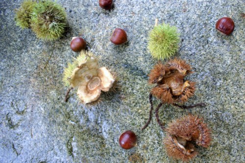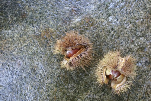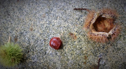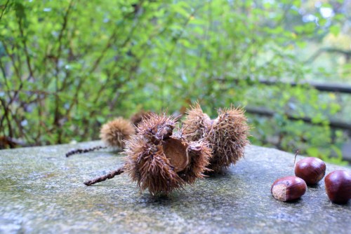 Sometimes when nothing is happening, something gallantly surfaces, or resurfaces if we were paying attention a few seasons ago. These first few days of October glow with gold. Full of wealth again from this evocative wash of prized sunlight across a window that was once opened. Lightly, trustingly, the gilded leaves fall from tall, gnarled trees around the grounds of our nest.Late afternoons inside the kitchen, I don’t mind the solitary twirls of a wandering leaf to keep me company as I wait for voices to bounce down the hallway.Out here in the forest, the climbing and wonder dwindle from our thoughts. Tiptoe, creep up the path tangled with thorns of September past, a depth and moodiness washing through the glass. Frogs croak no more, crickets’ songs once everywhere, now unheard. Weeds once yanked from the soil, now left untouched with thoughts that the approaching sky will leave it shriveled and eventually concealed with a mat of leaves. But further along underneath another shrouding path, a choir of mushrooms rejoice. Something sets off deep into the woods and just like that a house becomes a home.And although, I haven’t arrived at the story I wanted to tell you, the spaces between have been taking up thoughts in my head. Hence, with no results to show with the house that is, step by step I will be au fait with my home and know that the process will bring wealth again to my nest. Things are whipped and worn, other corners not faring so well…their stories waiting to be told. And while the spaces between have a ways to go, they are preparing to rejoice one square foot by one square foot. In the meantime, I’m trying to gather all the chestnuts before tires crush them with their past fates into the compost. It’s a feat; they are prickly and those puffy cheeked shade tails are swift and wily. I’m determined to get crafty myself in the kitchen before the arboreal rodents hoard them all for themselves, but more importantly I’ll forge on like my forest friends to make certain we stay tucked and safe in our nest.