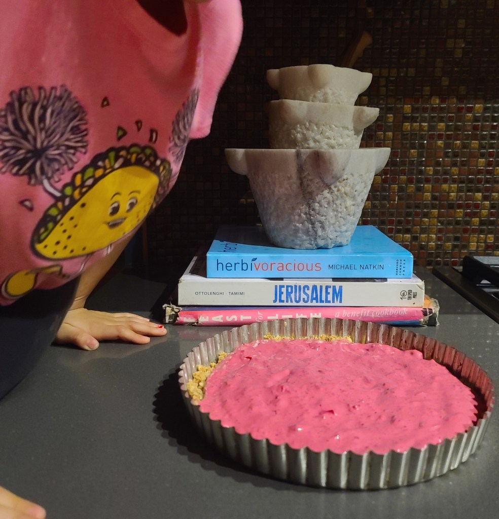 On tiny nails, chipped pink polish. On dusty floors, a pink balloon when not volleyed in the air. On a layer of cashew crust meant to be cookies, tart pink frosting from leftover cranberry sauce and a dollop of fresh crème to transform into our favorite hue. No reason for the festive accoutrements. We happen to be into pink these days. Just celebrating us. Just sharing to spread the passion in you. Just be you.