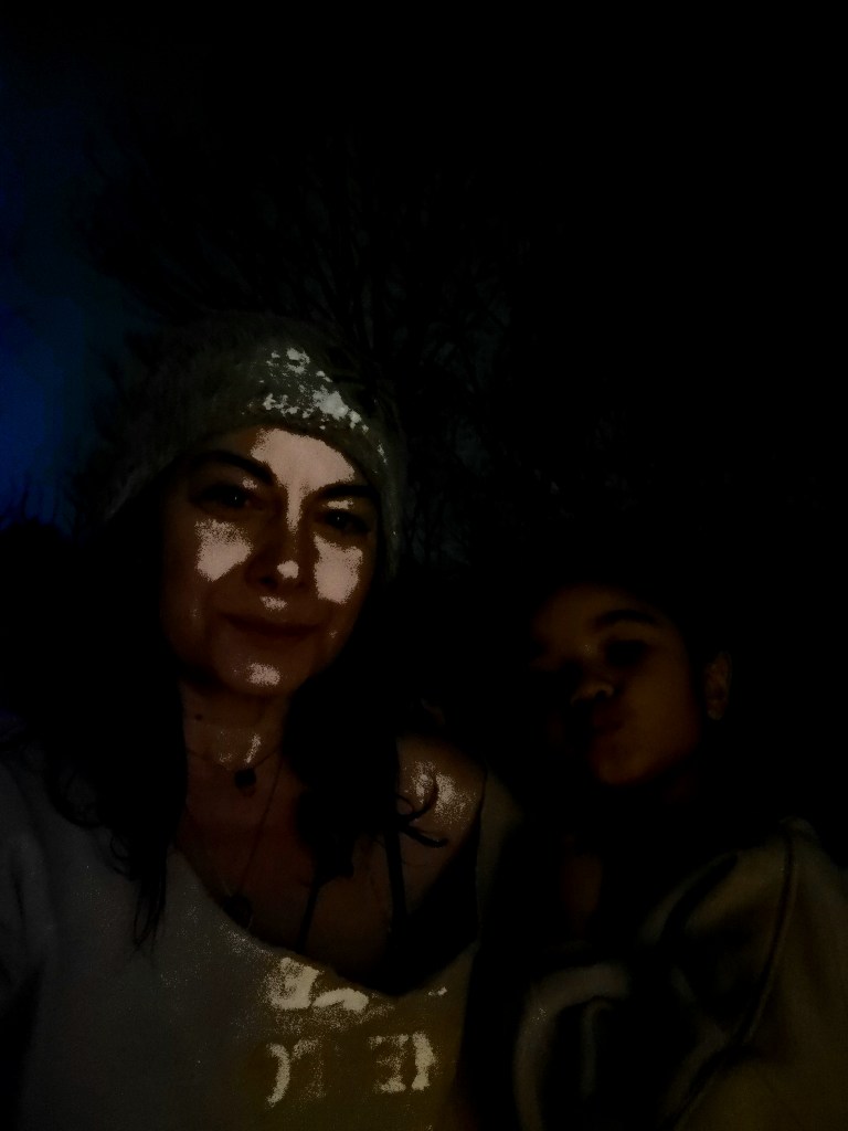 I’ve been listening to my little muse lately. I’ve mentioned before how intuitive children play and communicate and how we should take heed of their cues. I bet if you take note of their ideas and follow through, you’ll find yourself exactly where you need to be at that moment. Anyone familiar with yoga knows this as samasthiti. It’s comforting to spend my days in this midst of travesty and collapse to get to know this little fledgling and fulfil her inklings. Never more so than now am I grateful for this gift. Today, she throws on a sweatshirt and requests that I wear the same one. It’s our take me to paradise one. This little bear can find paradise anywhere. While I offer my praises every morning to Red for being blessed to dwell within her cozy domicile, I know in my heart this is not my samasthiti. In Ashtanga method, samasthiti (equal standing) is a command to attention, a bringing of awareness to breath and returning to our center. Our nest tucked into our woods is something to be revered…forces at work no doubt. Yet while these old oaks like gods remind me how mortal we are, I would prefer to be surrounded by trees that bear tropical fruit to be plucked at whim and swill the nectar of the gods as we walk along a shore-lined scene. This evening as we watch the flakes accrue forming silvery beards on our surrounding gods as they tower and protect, I’m grateful that this little one encouraged me to step out and take a peek. Her unique point of attention affirmed to me this nest was needed at this flash of time. Out here, the dark night backdrop of the vast forest expresses all that is, all that has been and all that ever can be. A celebratory twinkling moment to see the uniqueness of ourselves. Open-up to become ever more than you can imagine. I know my paradise is near and when I arrive, samasthiti she’ll be named. An auspicious house name will invite fortune upon the home dwellers so do put some thought into the practice. See who Red is https://thefolia.com/2017/04/09/red/.