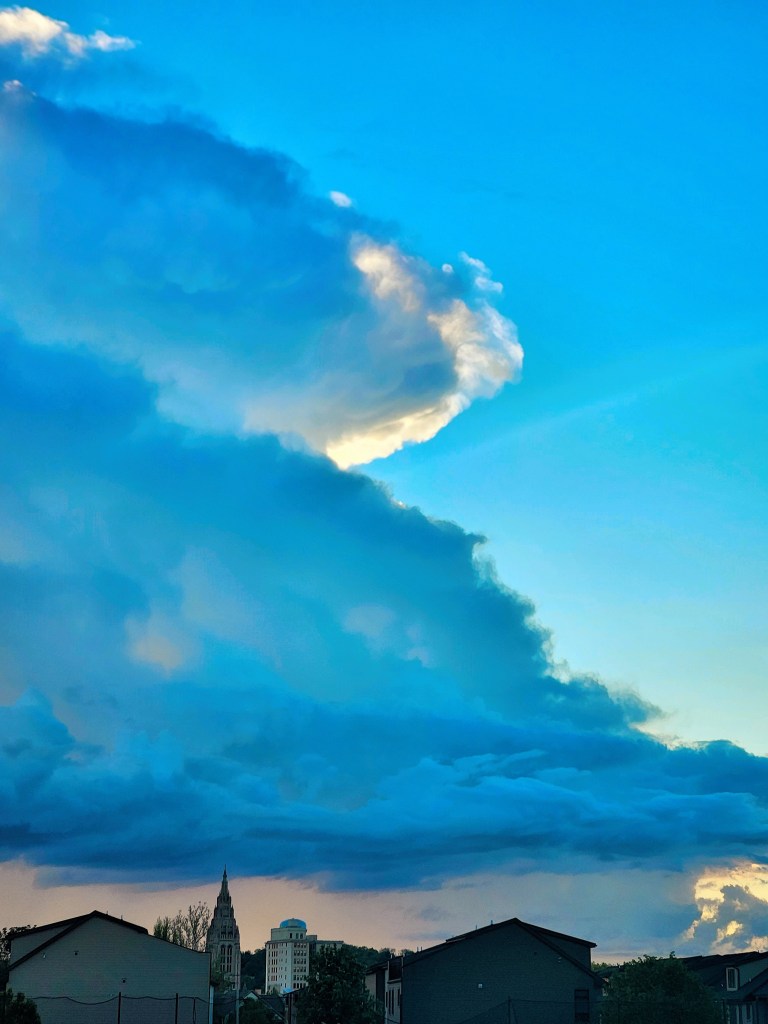 Ever wonder about the drops? Rampant and rallying together burgeoning with water…all pent-up with that potential energy in an expanding cloud. What do you think they are feeling or thinking? I bet it’s not terror. Perhaps a bit of anxiety in their waiting. I bet they are nudging each other racing to the edges, waiting on their marks to burst out with an unquenchable thirst to be that first drop that plunges into the ocean to join the ranks of a tidal wave; free falling into a bud to taste its sweet nectar; or teaming up with a squad aligning to form a rainbow. What tiny, brave adventurers they must all be. Looking up at this cumulus cloud hovering over me, I would feel like a trail blazer eager to dive into the unknowing below. I’m headed for the highest mountain and cannonballing into a brook atop…see you downstream where we glide into the waterfall. Yep, that’s got to be what those drops are thinking. No matter where they land, I bet it’s the sweetest of surrenders. Fear not, something bigger more magnificent is in the making little droplet.