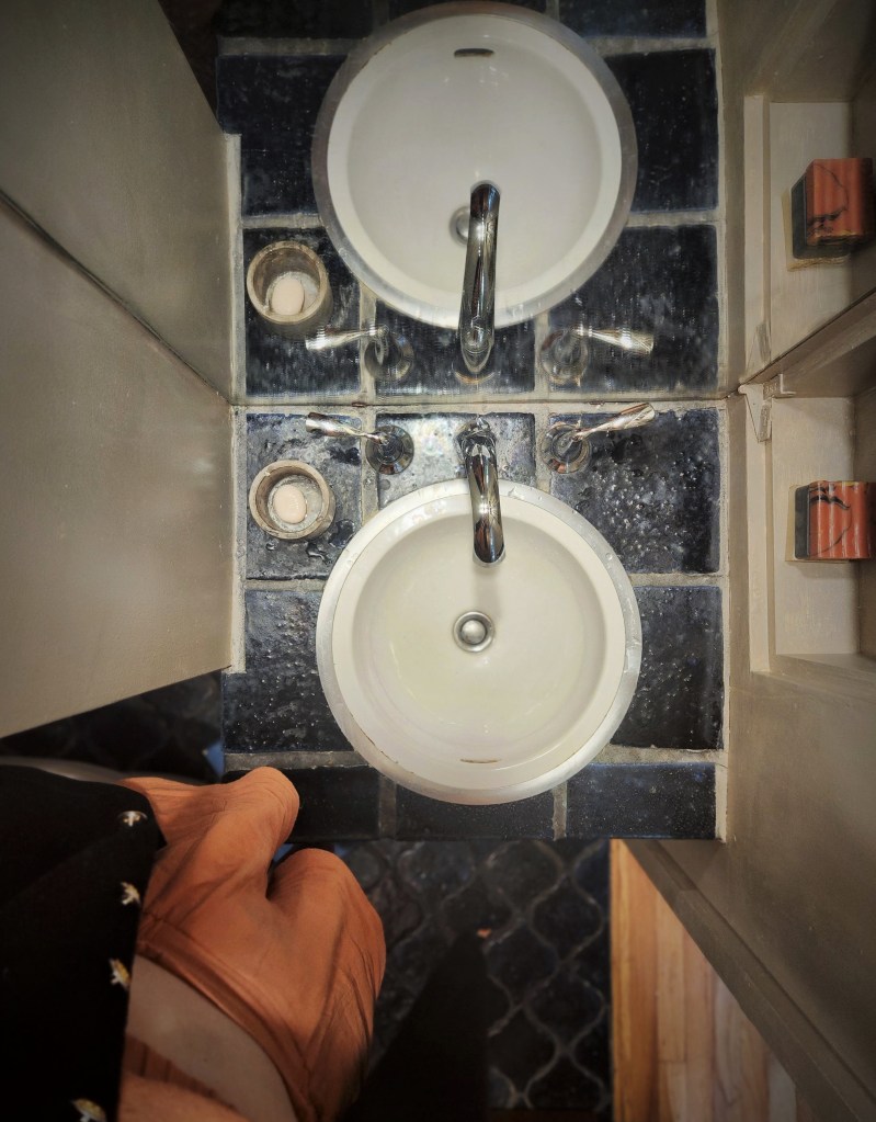 I offer this enantiomorphic shot that reflects my terra cotta ensemble toning my freshly painted powder room and next-in-line bars of soap dually functioning as aromatic fresheners. Bidding you well on this fine fall equinox of a day…embrace the opportunity to establish balance and harmony, to take stock of where you are, where you want to be and find that balance.