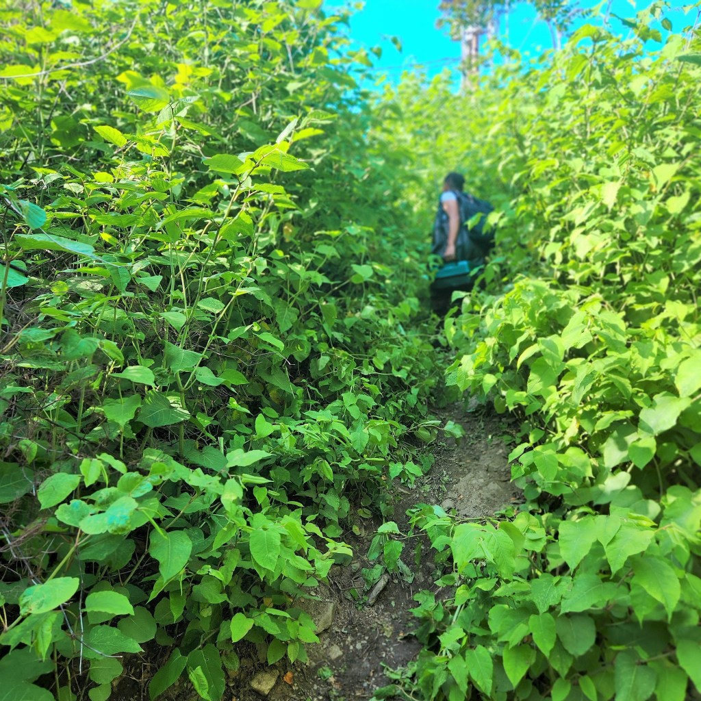 Going in deep. a rod, a reel up a trailside and alongside a roaring river. Staking out his own fishing grounds, awed by the dedication for a late afternoon craft.